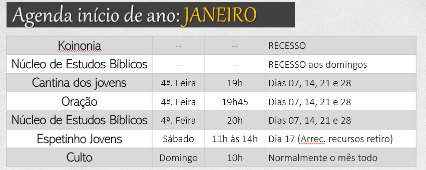 Não haverá aula aos domingos (NEB) durante os meses de dezembro e janeiro.